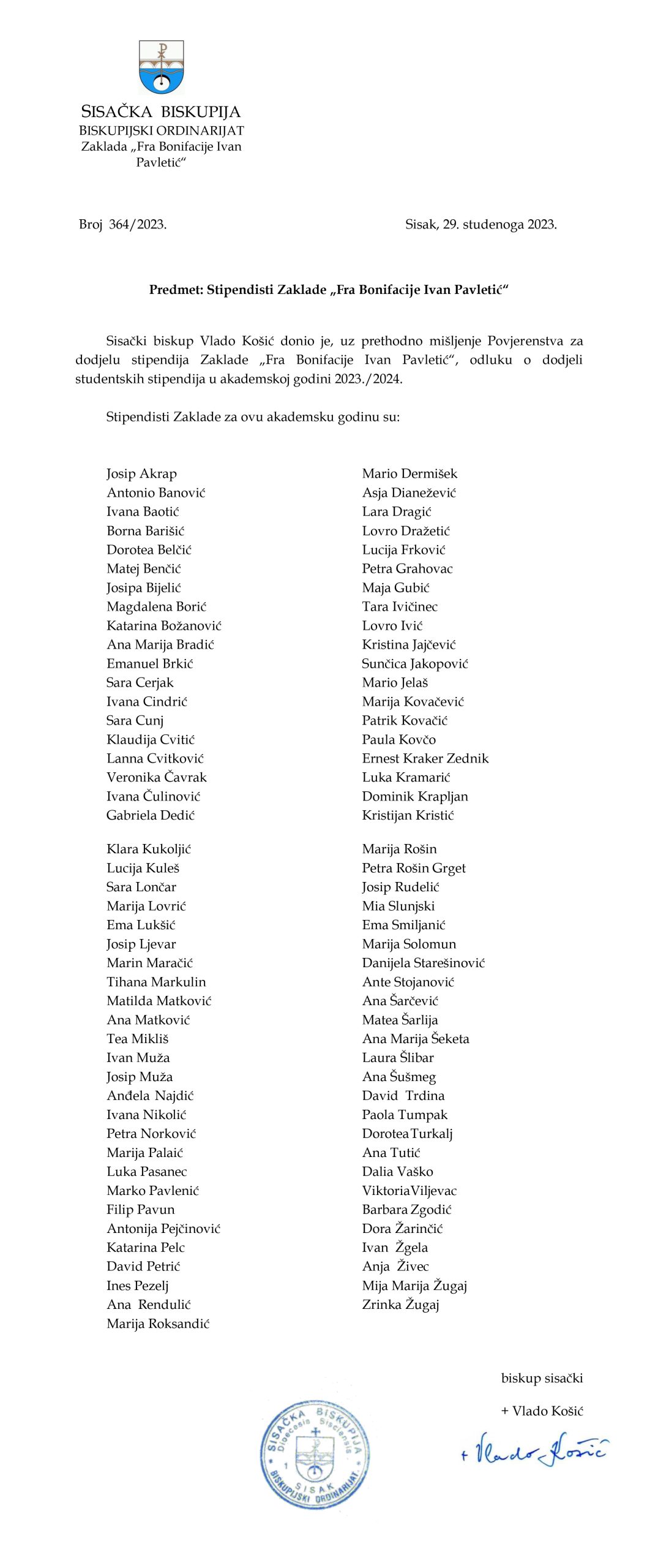 Sisački biskup Vlado Košić donio je, uz prethodno mišljenje Povjerenstva za dodjelu stipendija Biskupijske zaklade „Fra Bonifacije Ivan Pavletić“, odluku o dodjeli studentskih stipendija u akademskoj godini 2023./2024.