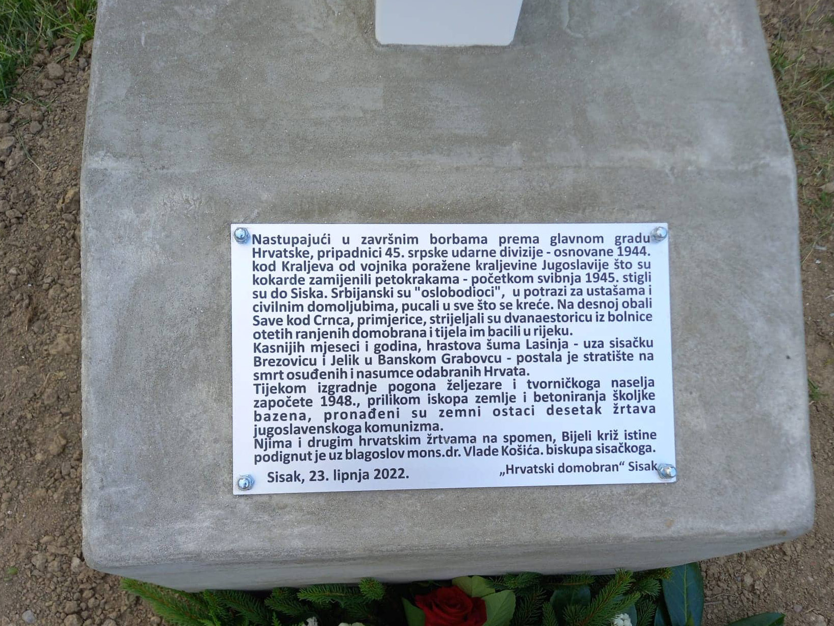 Na inicijativu sisačkog ogranka Hrvatskog domobrana postavljen je i u četvrtak, 23. lipnja u sisačkom Naselju ispred Pastoralnog centra župe Pohoda BDM, blagoslovljen Bijeli križ istine. Kako je tom prigodom predsjednik Hrvatskog Domobrana Josip Frković rekao, već pet godina se pokušavala dobiti dozvola da se taj križ postavi uz šumu Lasinja, no kako ista nije dobivena našlo se mjesto u vlasništvu župe. Ovaj je križ podignut u spomen na preko 800 razoružanih hrvatskih vojnika i civila koje su poslije Drugog svjetskog rata partizani pobili u šumi Lasinji, i čije kosti velikim dijelom leže ispod pogona Željezare.