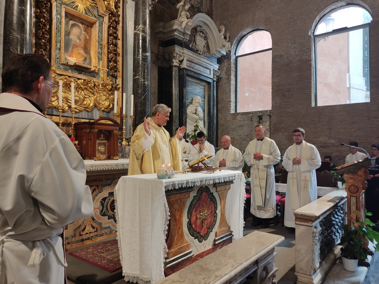 Svetu misu tog dana u krstionici, kapeli sv. Venancija u bazilici sv. Ivana Lateranskoga predvodio je biskup Košić, a koncelebriralo je više svećenika koji su zajedno sa svojim vjernicima na ovom hodočašću. Na slavlju su im se pridružila i dvojica svećenika Sisačke biskupije na studiju u Rimu Hrvoje Zovko i Marin Mlađenović.