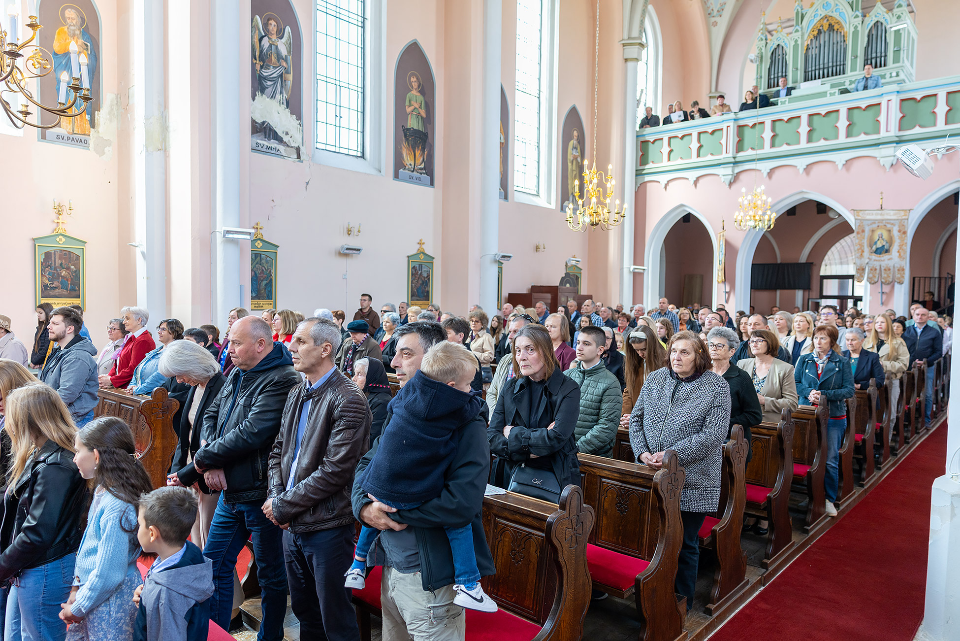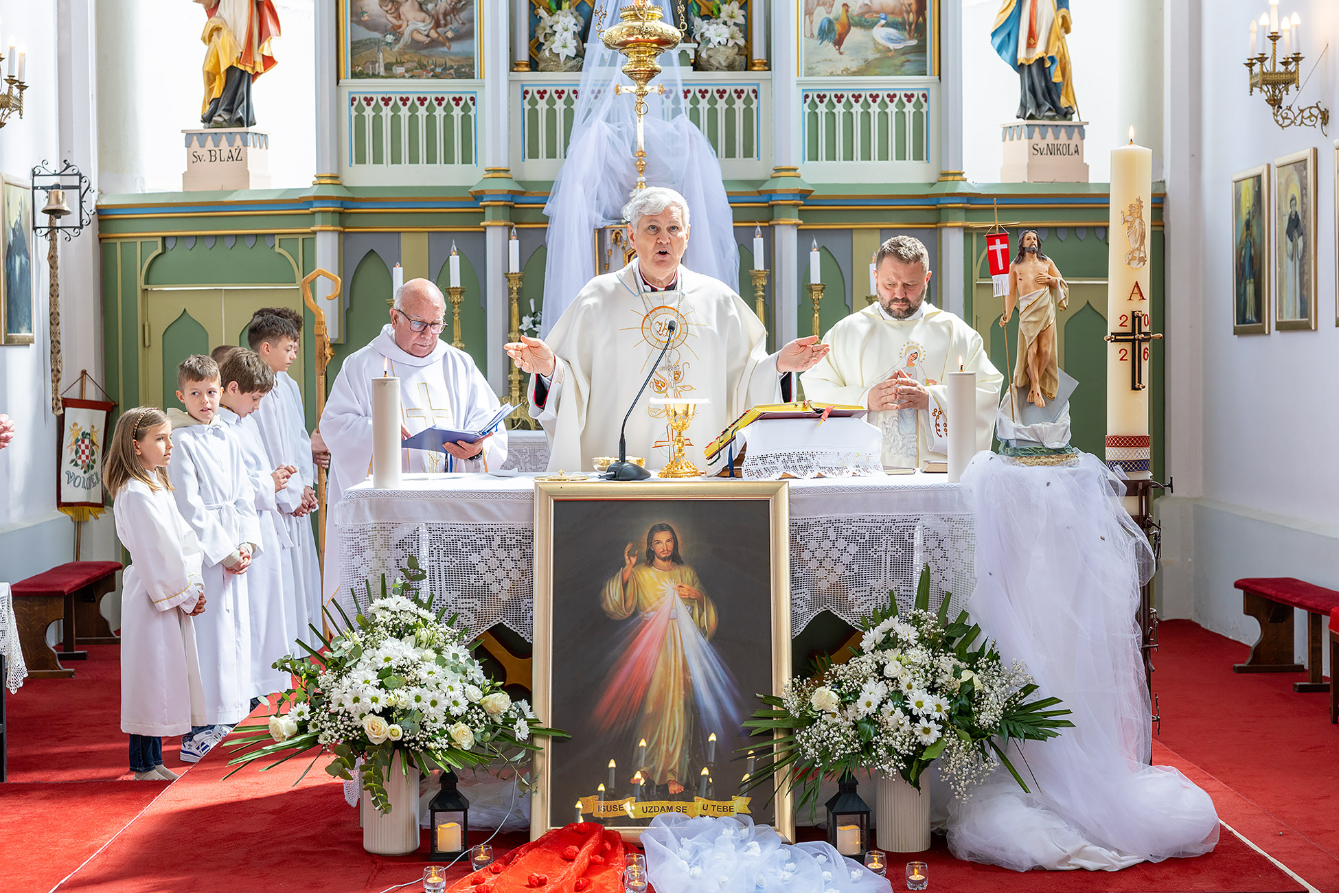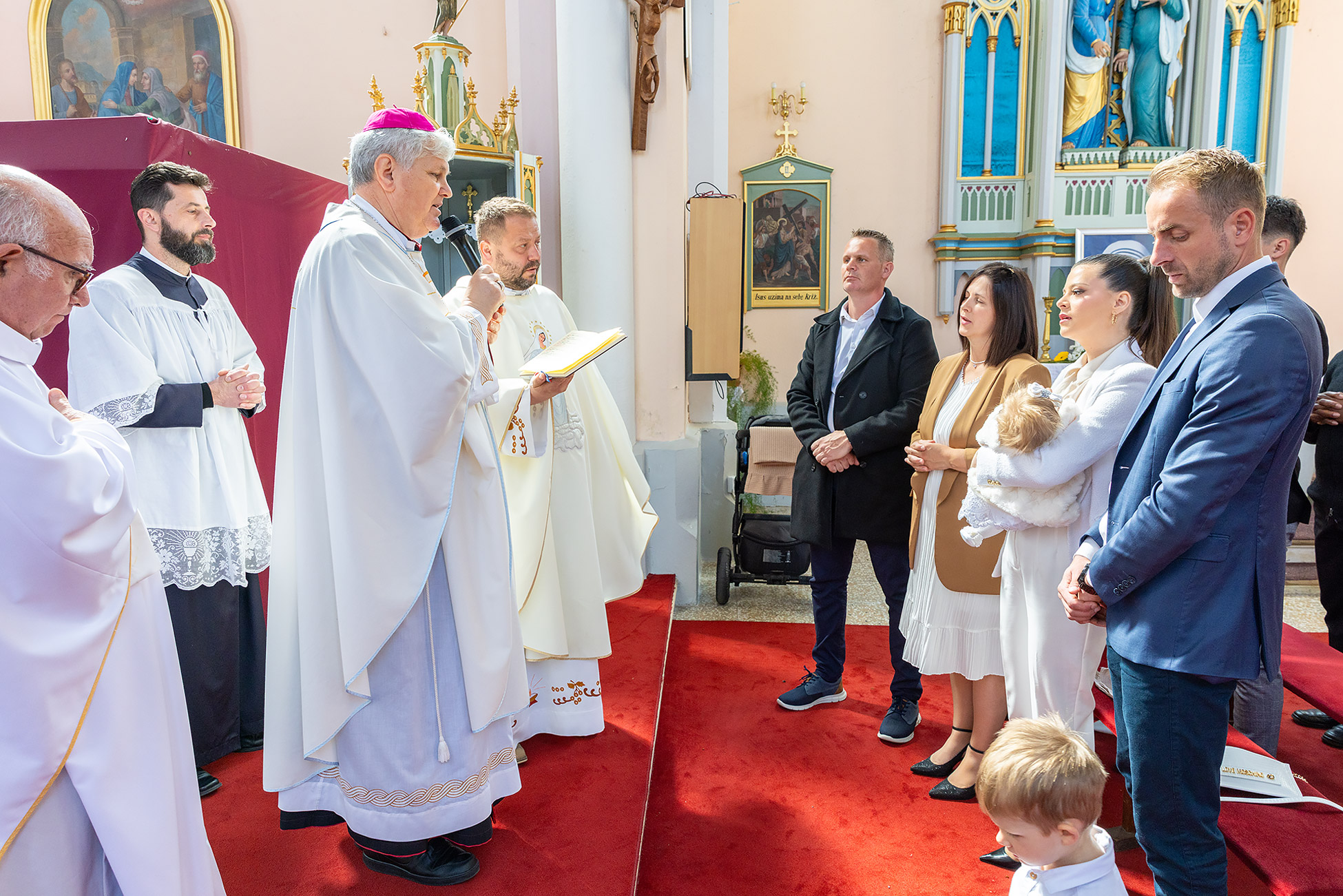 Sisački biskup Vlado Košić predvodio je u Nedjelju Božjeg milosrđa, 12. travnja 2026., u župnoj crkvi sv. Antuna Padovanskog u Voloderu misno slavlje tijekom kojeg je krstio Anu, šesto dijete u obitelji Tomislava i Renate Gulija. Koncelebrirali su domaći župnik Marijan Štingl i p. Gioacchino Santoro.