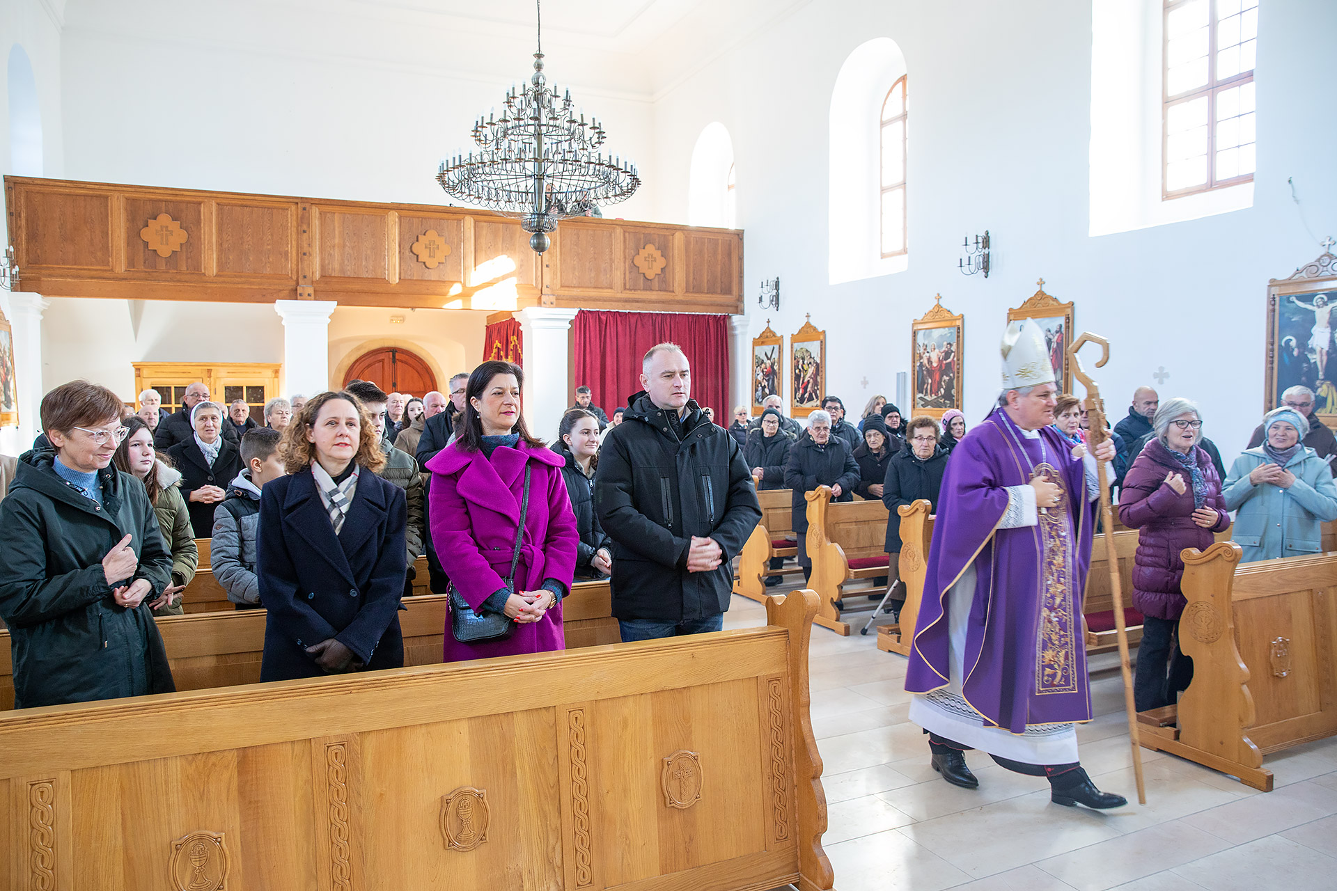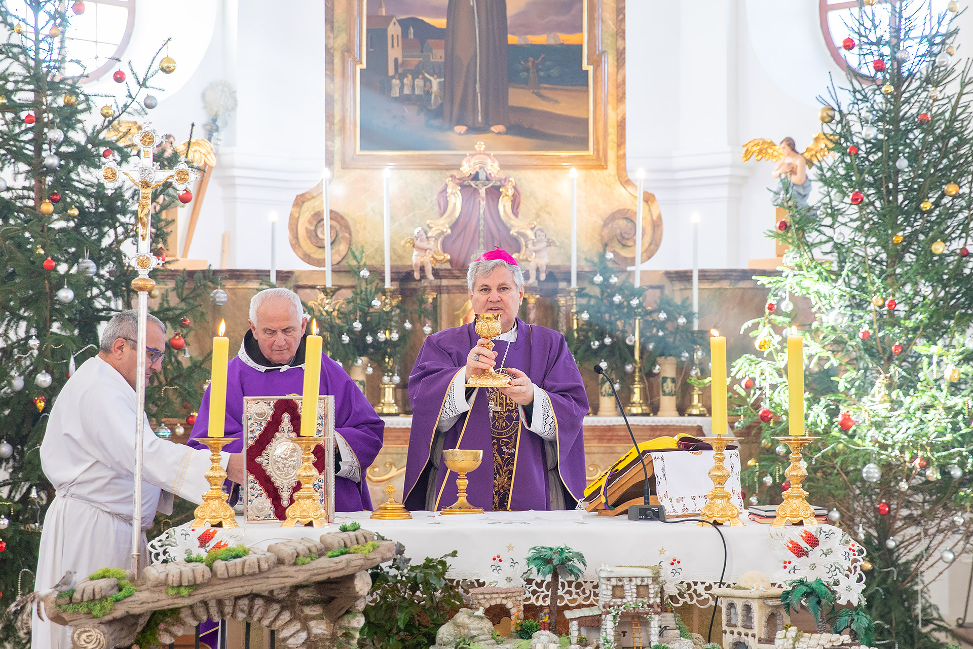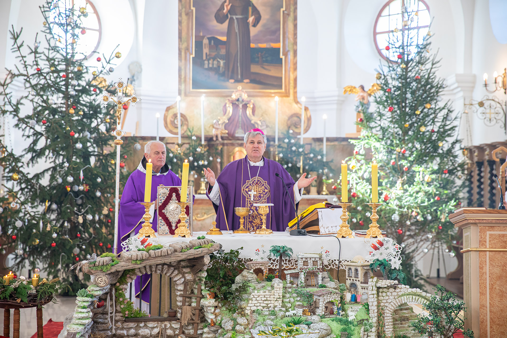 Na početku, biskup je izrazio veliku zahvalnost Bogu i svima onima koji su omogućili da se ova crkva obnovi. Rekao je i da iako je plan bio da se do kraja ove godine završi obnova pet crkvi, obnova je spora i složena te je samo ova sv. Antuna Padovanskog gotova. „Ovo je prva crkva, spomenik kulture, na području naše biskupije koja je nakon stradanja u potresu obnovljena. Trenutno se obnavlja njih 25, za koje se nadamo da će konstruktivni dio radova biti gotov tijekom sljedeće godine, tu su još i župne kuće i kapele. Doista smo zahvalni na pomoći svima onima koji su ovo omogućili. Tu prije svega mislim na Ministarstvo kulture i medije putem kojeg su nam odobrena sredstva EU za obnovu, zatim zahvaljujem i izvođaču radova na crkvi, tvrtki Spegra, na dobro odrađenom poslu. Ova crkva je kao Grad na gori naše Banovine i zaslužila je da ponovo bude u punom sjaju, a ova mala zajednica te brojni hodočasnici sv. Antunu zaslužili su da se mogu ovdje moliti te da mogu slaviti sveta otajstva i već ove godine zajedno proživljavati otajstvo Kristova rođenja“, poručio je biskup.