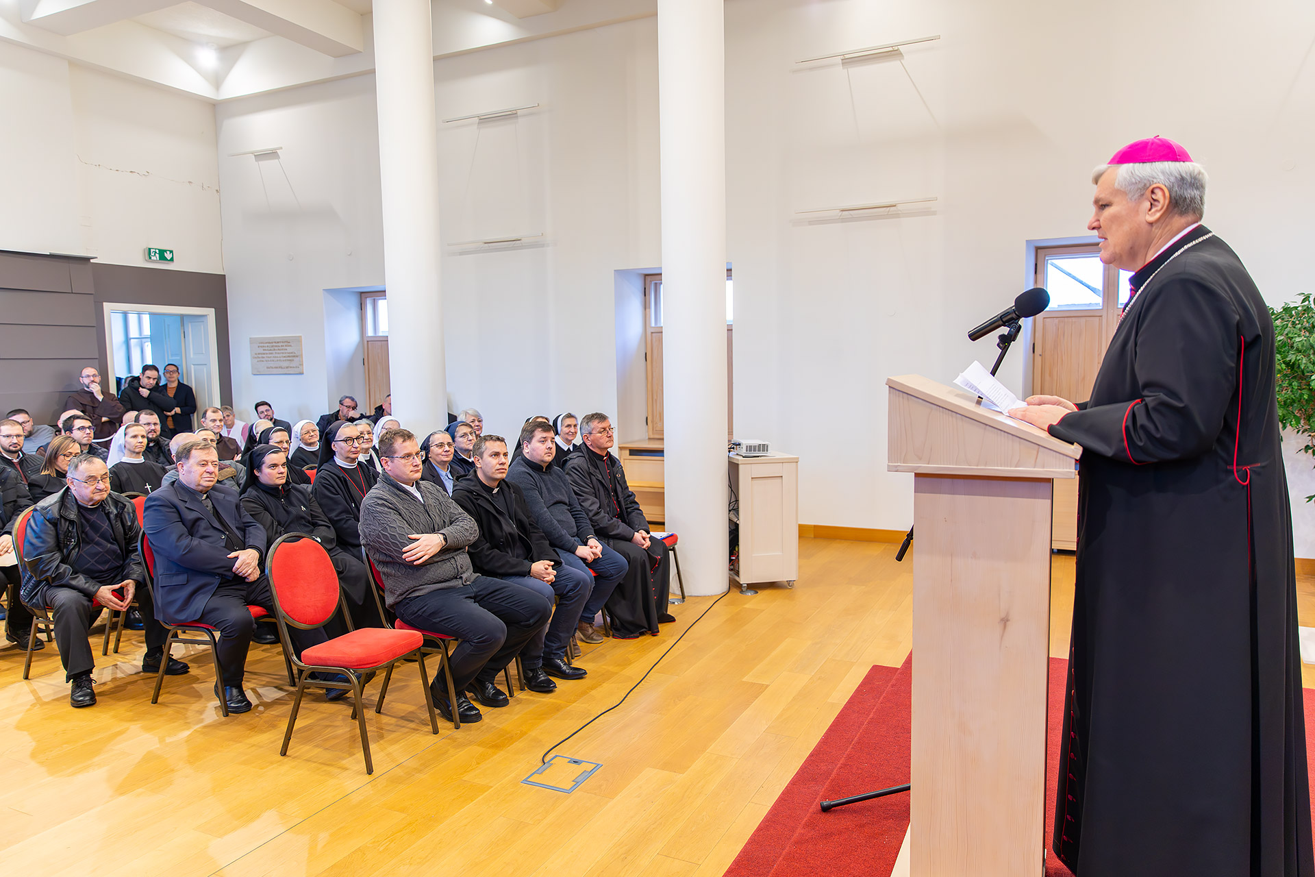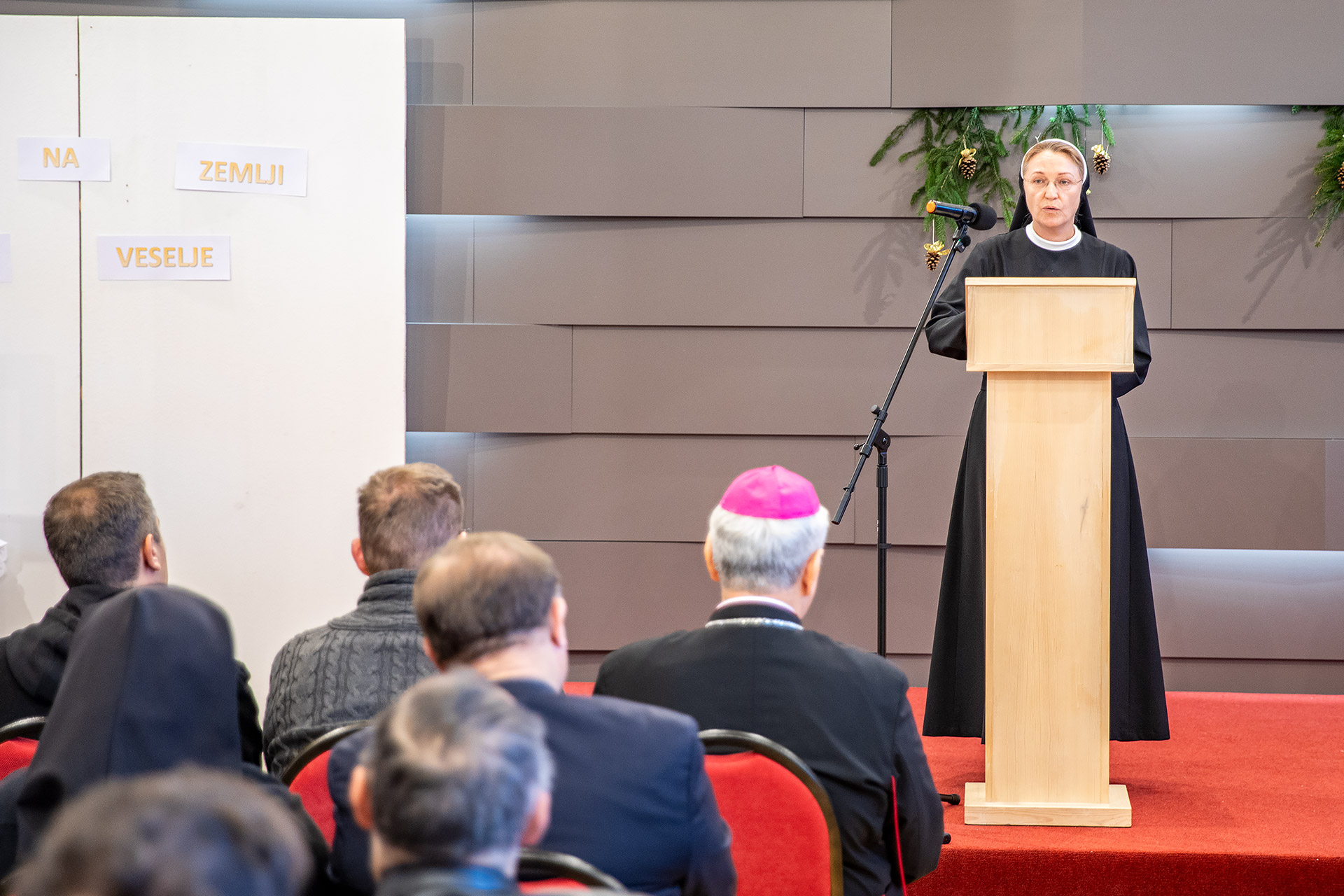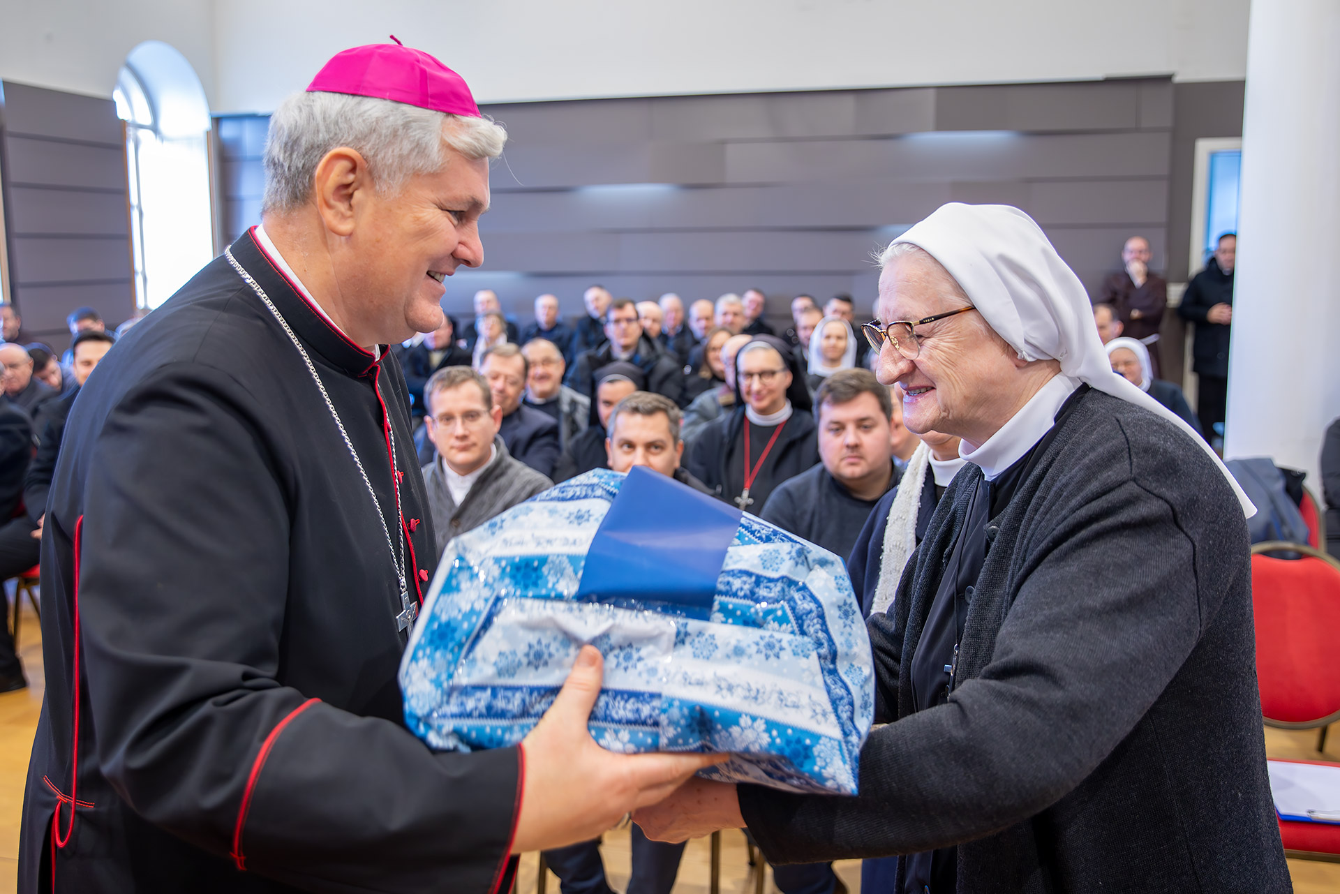 U ime redovnika i redovnica okupljenima se obratila s. Snježana Pavić, zahvalivši Bogu za proteklu jubilarnu godinu. Naglasila je važnost praštanja i povjerenja u Boga u vremenu obilježenom nesigurnostima, ratovima i patnjama mnogih ljudi. Zahvalila je biskupu na njegovoj blizini, brizi i potpori redovničkim zajednicama, kao i na posebnoj osjetljivosti prema najslabijima, obiteljima, djeci i mladima, što se očituje u pastoralnim i odgojnim projektima biskupije. Uputila je božićnu poruku mira, nade i povjerenja u Krista – Emanuela.