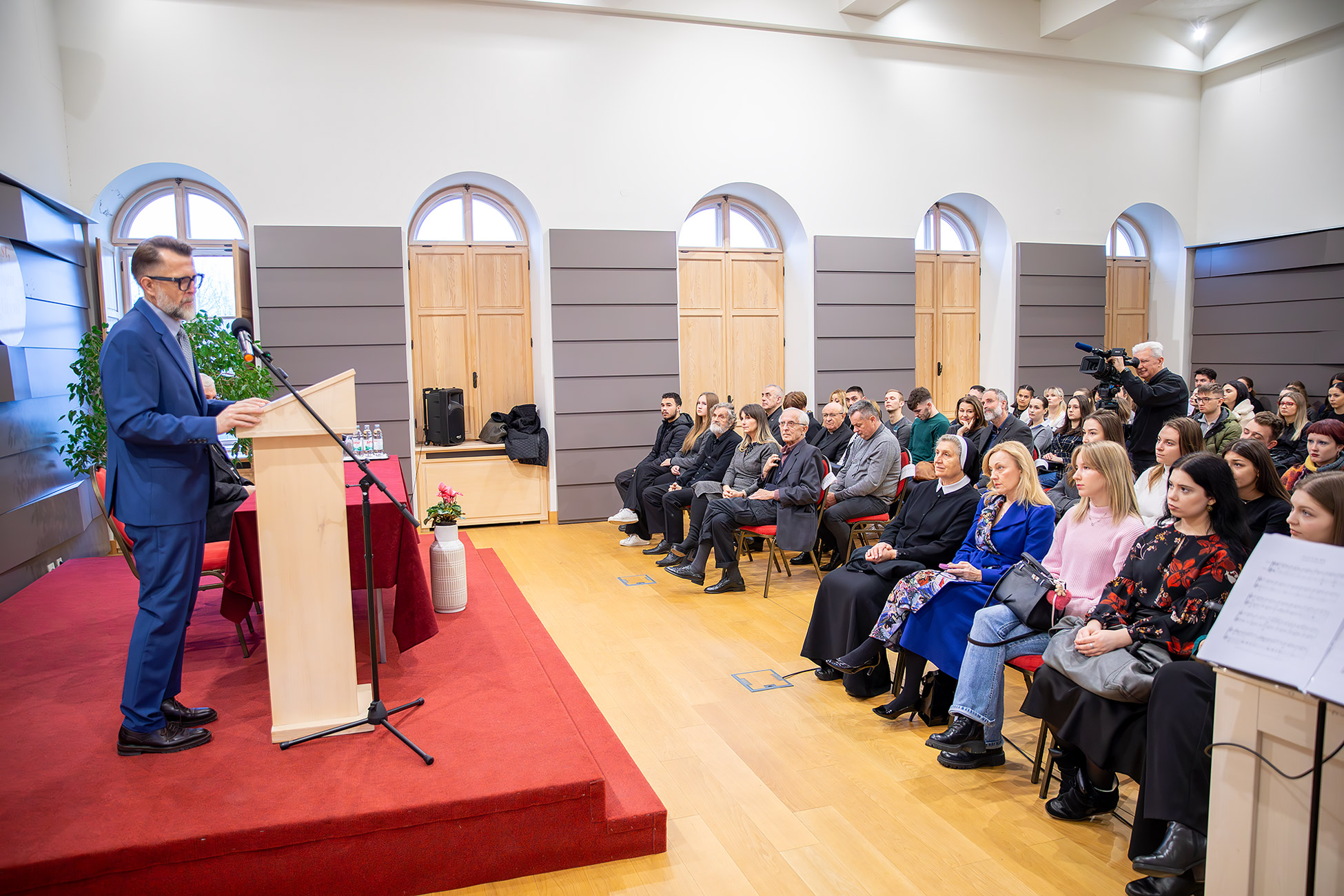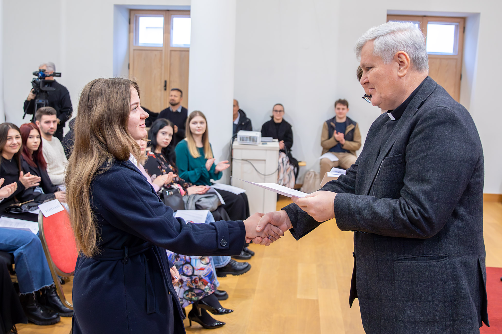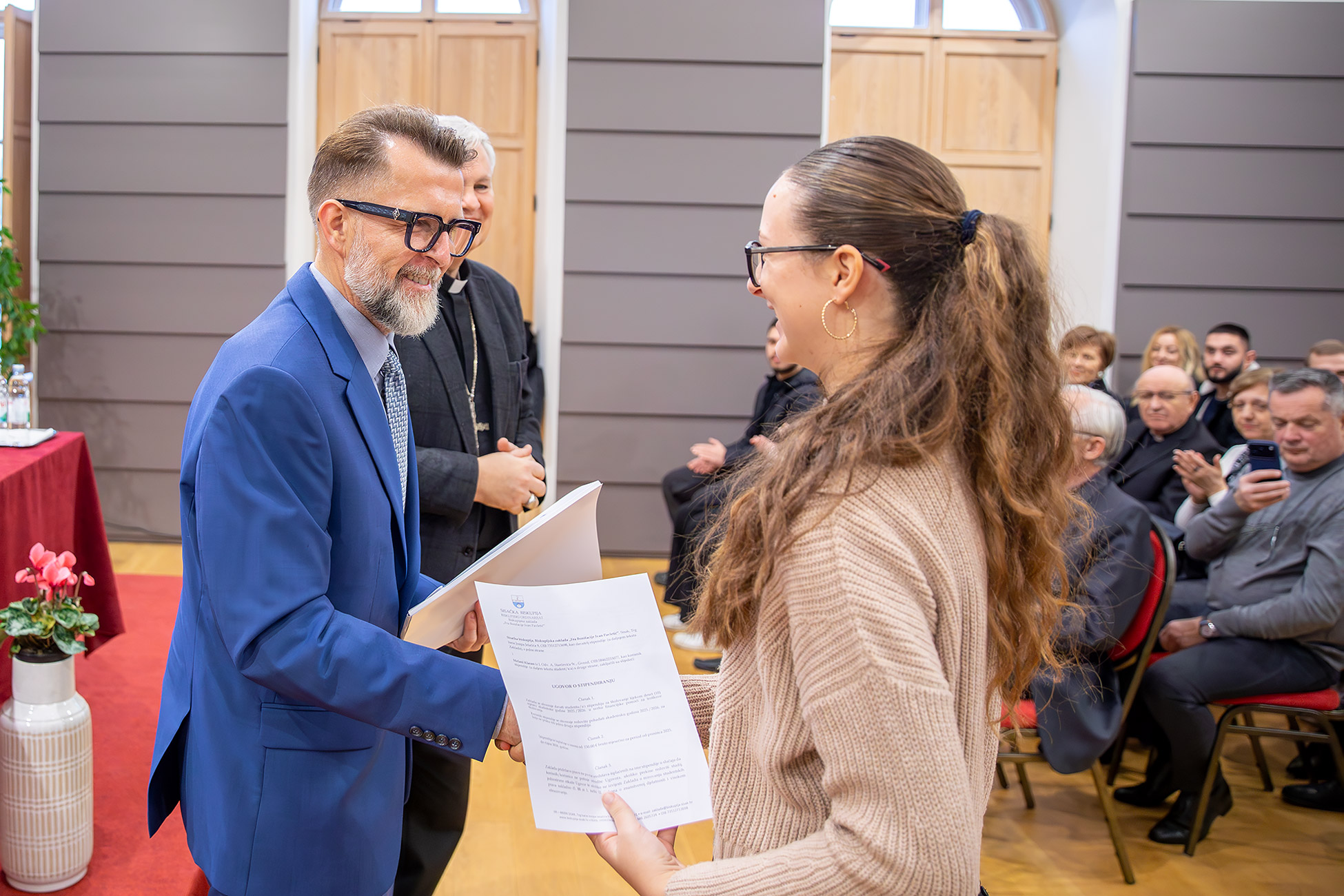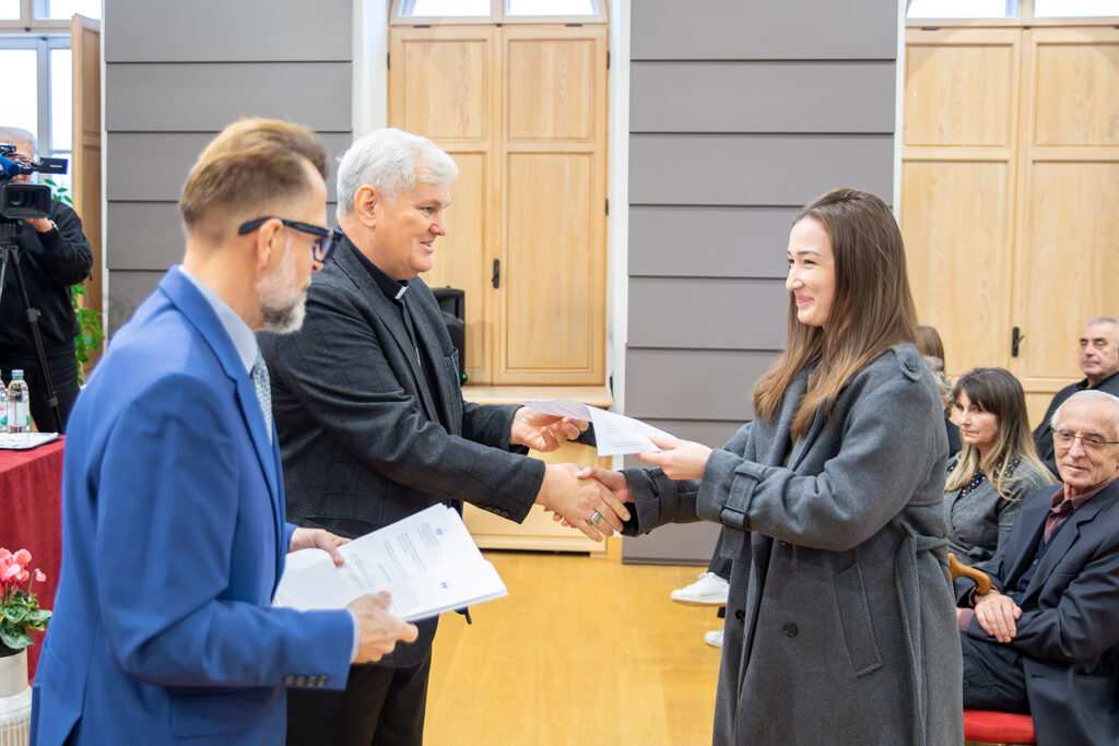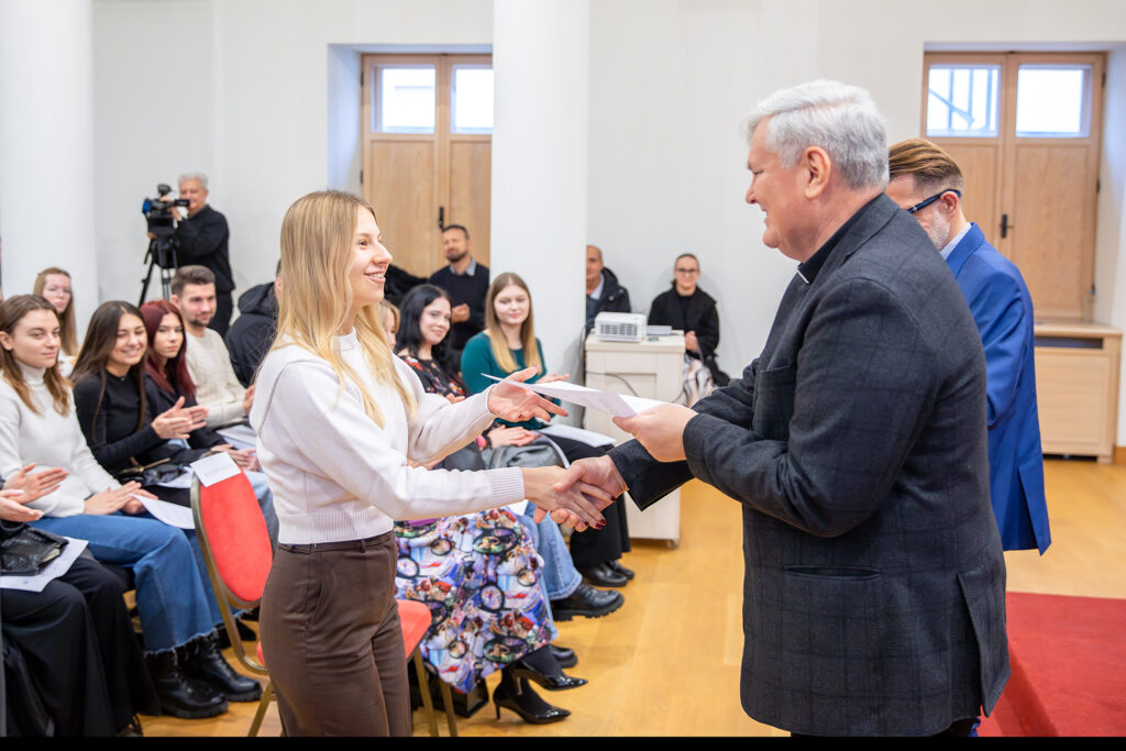 Na početku je sve okupljene pozdravio ravnatelj Mosler, podsjetivši na put koji je Zaklada prešla od svoje prve godine djelovanja, kada je dodijeljeno oko trideset stipendija, pa do današnje brojke koja prelazi stotinu. „Svaka prijava je jedna mala priča – drama, humor, slika života naše biskupije“, rekao je Mosler, zahvalivši članovima Povjerenstva za dodjelu stipendija, župnicima koji su pisali preporuke te svima koji prate rad Zaklade. Istaknuo je kako se stipendije dodjeljuju prema trima temeljnim kriterijima: vjerskoj zauzetosti, akademskoj uspješnosti i socijalnoj osjetljivosti, naglasivši da je svaka odluka donesena u dubokom poštovanju prema stvarnim životnim okolnostima studenata.