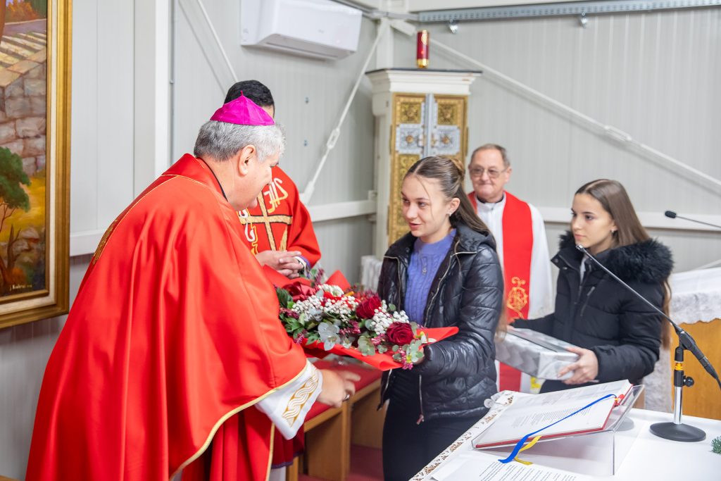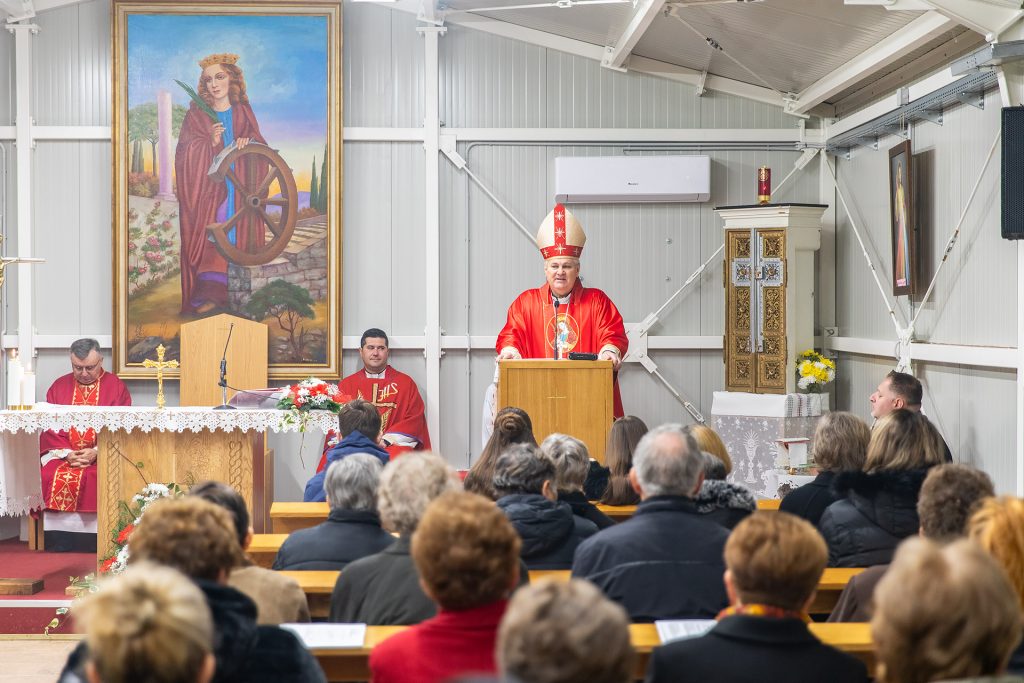 U homiliji biskup je podsjetio na život sv. Katarine, djevice i mučenice koja je svoj život položila za Krista početkom 4. stoljeća istaknuvši kako mi sigurno možemo puno naučiti od mučenika, jer oni su svjedoci za Krista, ne riječima nego svojom krvlju, svojim životom te jer je njima važniji bio Krist nego vlastiti život. Istaknuvši Katarinino mučeništvo biskup je ispričao i zgodu zbog koje je postala zaštitnica znanstvenika, a koja dokazuje da vjera i znanost nisu u suprotnosti. „Tadašnji upravitelj Aleksandrije Maksimilijan tražio je da se ona za njega uda i da ostavi vjeru u Krista jer su oni imali svoje poganske bogove. Ona nije željela ni moć ni silno to bogatstvo i zato je odbila i ostala vjerna Kristu. On je mislio da ju može obratiti pa je doveo 50 najmudrijih znanstvenika. Pokušali su je uvjeriti da je u krivu, da Isus nije Bog, ali je nakon duge rasprave ona uvjerila njih i oni su prihvatili Krista te su željeli postati kršćani. Kada je to saznao Maksimilijan dao ih je pogubiti, a nju mučiti. Zato se često prikazuje s kolom s noževima jer su je na tom kolu mučili, ali njoj se ništa nije dogodilo već se kolo raspalo te su je na kraju pogubili“, rekao je biskup dodavši kako smo zahvalni Bogu za svjedočanstvo sv. Katarine i svih svetih koji su bili spremni toliko voljeti Isusa i uz njega prianjati da ni svoj život nisu štedjeli.