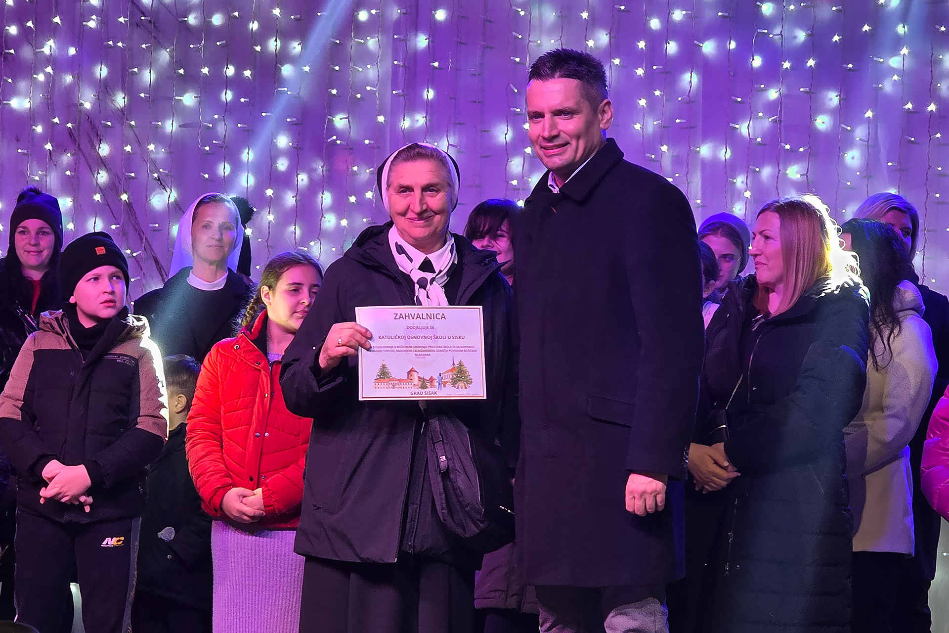 Katoličkoj osnovnoj školi Sisak uručena je zahvalnica za sudjelovanje u božićnom uređenju školskog prostora te za doprinos stvaranju toplog, radosnog i blagdanskog ozračja uoči božićnih blagdana, a zahvalnicu je preuzela ravnateljica škole s. Smilja Čirko.