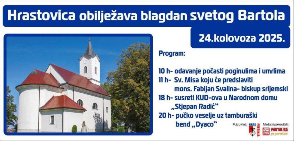 Hrastovica će u nedjelju, 24. kolovoza 2025., svečano proslaviti blagdan svog nebeskog zaštitnika svetog Bartola. Program započinje u 10 sati odavanjem počasti poginulim i umrlim mještanima, nakon čega će u 11 sati uslijediti svečano misno slavlje koje će predvoditi srijemski biskup mons. Fabijan Svalina.