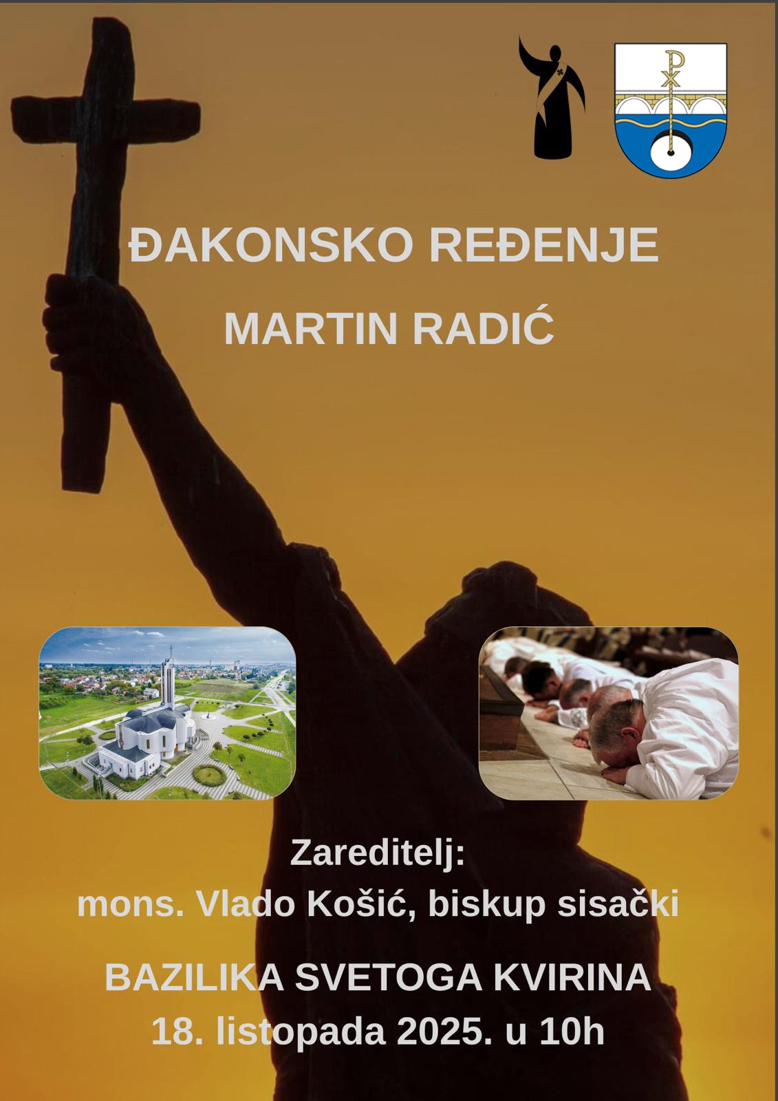 Sisački biskup Vlado Košić predvodit će u subotu, 18. listopada, u 10 sati svečano misno slavlje u bazilici sv. Kvirina u Sisku, tijekom kojega će red đakonata primiti kandidat Martin Radić.