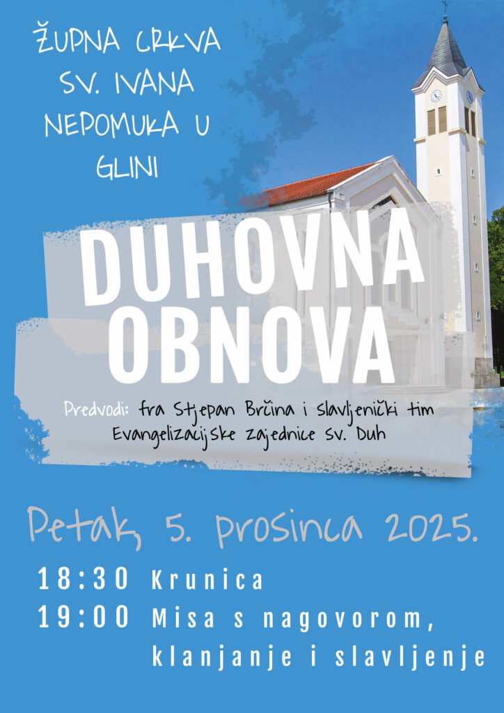 Adventska duhovna obnova u Glini održat će se u petak, 5. prosinca 2025., u župnoj crkvi sv. Ivana Nepomuka. Program započinje u 18 sati molitvom krunice, nakon čega u 19 sati slijedi misa s nagovorom, klanjanje i slavljenje. Duhovnu obnovu predvodit će fra Stjepan Brčina sa slavljeničkim timom Evangelizacijske zajednice Sveti Duh.
