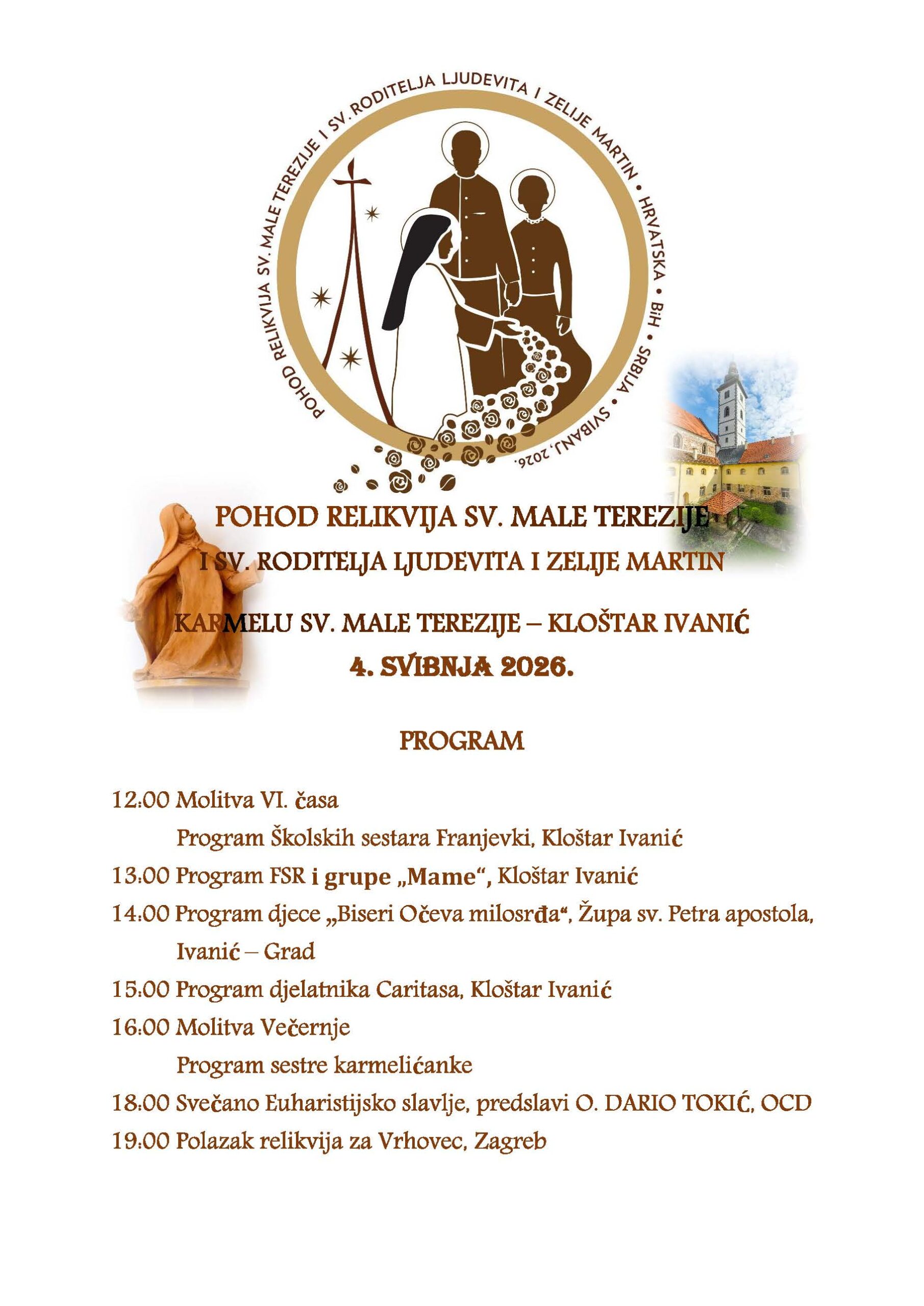 Relikvije sv. Male Terezije i njezinih sv. Roditelja stižu u Karmel sv. Male Terezije ( Kloštar Ivanić) 4. svibnja ove godine. Sve vas s velikom radošću pozivamo na sudjelovanje u čašćenju relikvija u samostanu sestara karmelićanki. Prigodni program počinje u 12:00, a trajat će do 18:00 sati kada započinje svečano euharistijsko slavlje koje će predslaviti o. Dario Tokić, karmelićanin. Po završetku sv. Mise relikvije polaze za Vrhovec (Zagreb).
