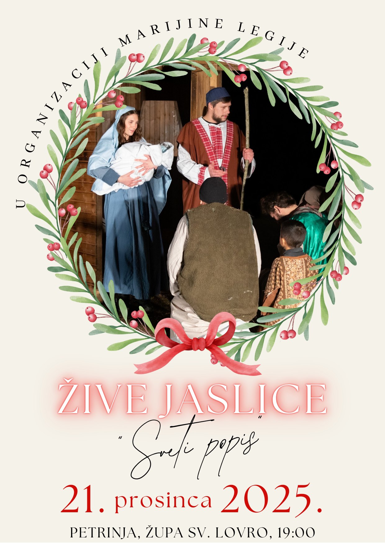 Tradicionalni glazbeno-scenski prikaz Isusova rođenja pod nazivom „Sveti popis“ Marijini legionari izvest će u nedjelju, 21. prosinca 2025., u 19 sati ispred župne crkve sv. Lovre u Petrinji.