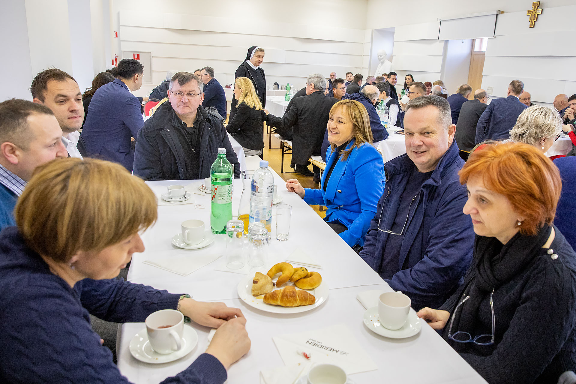 Nakon pročitane Božje Riječi doručak je molitvom otvorio biskup Košić koji je i pozdravio sve okupljene, a dok je gošću Jakšić i njezin rad okupljenima predstavila voditeljica Ureda za promicanje socijalnog nauka Crkve Kornelija Marović.