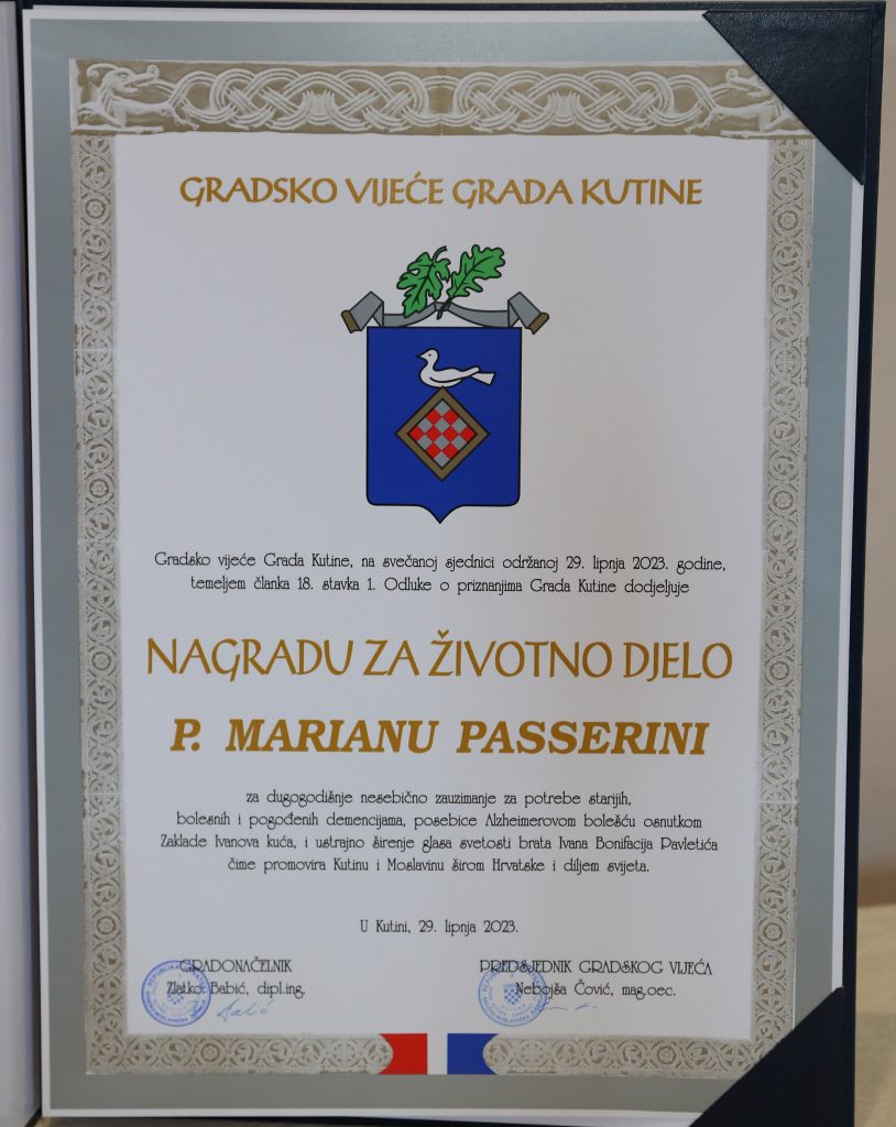 U četvrtak, 29. lipnja na svečanoj sjednici Gradskog vijeća Grada Kutine, održanoj povodom Dana grada Kutine, Nagrada za životno djelo uručena je p. Marianu Passerini za dugogodišnje nesebično zauzimanje za potrebe starijih, bolesnih i pogođenih demencijama, posebice Alzheimerovom bolešću osnutkom Zaklade Ivanova kuća, kao i za ustrajno širenje glasa svetosti brata Ivana Bonifacija Pavletića čime ujedno promovira Kutinu i Moslavinu širom Hrvatske i svijeta.