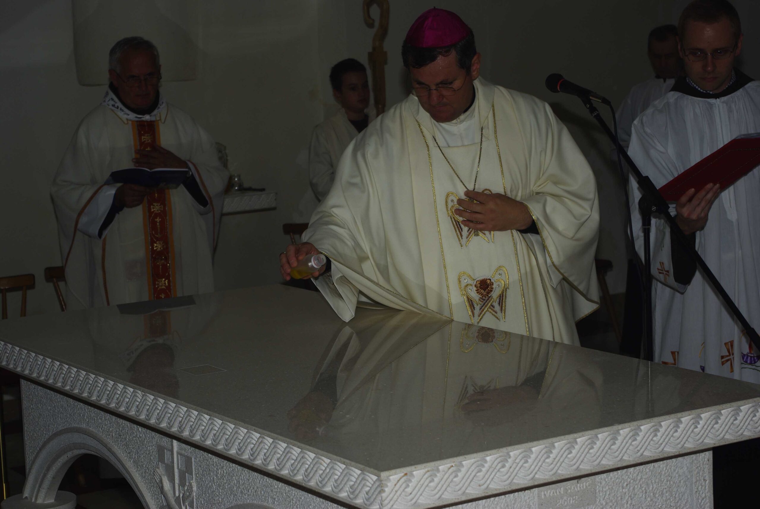 Potom je biskup mons. dr. Vlado Košić uveo u slavlje kratkim govorom o otajstvu Crkve. Zatim je predao upravitelju župe fra Stjepanu Jambrošiću ključ crkve da otvori crkvu. Upravitelj župe je tada otvorio crkvu te je procesija na čelu s biskupom mons. dr. Vladom Košićem ušla u crkvu pjevajući pjesmu ‘Uđite s hvalama na vrata njegova’. Potom je Biskup blagoslovio vodu i poškropio zidove crkve, vjernike i oltar. Nakon Službe čitanja Biskup je imao homiliju.