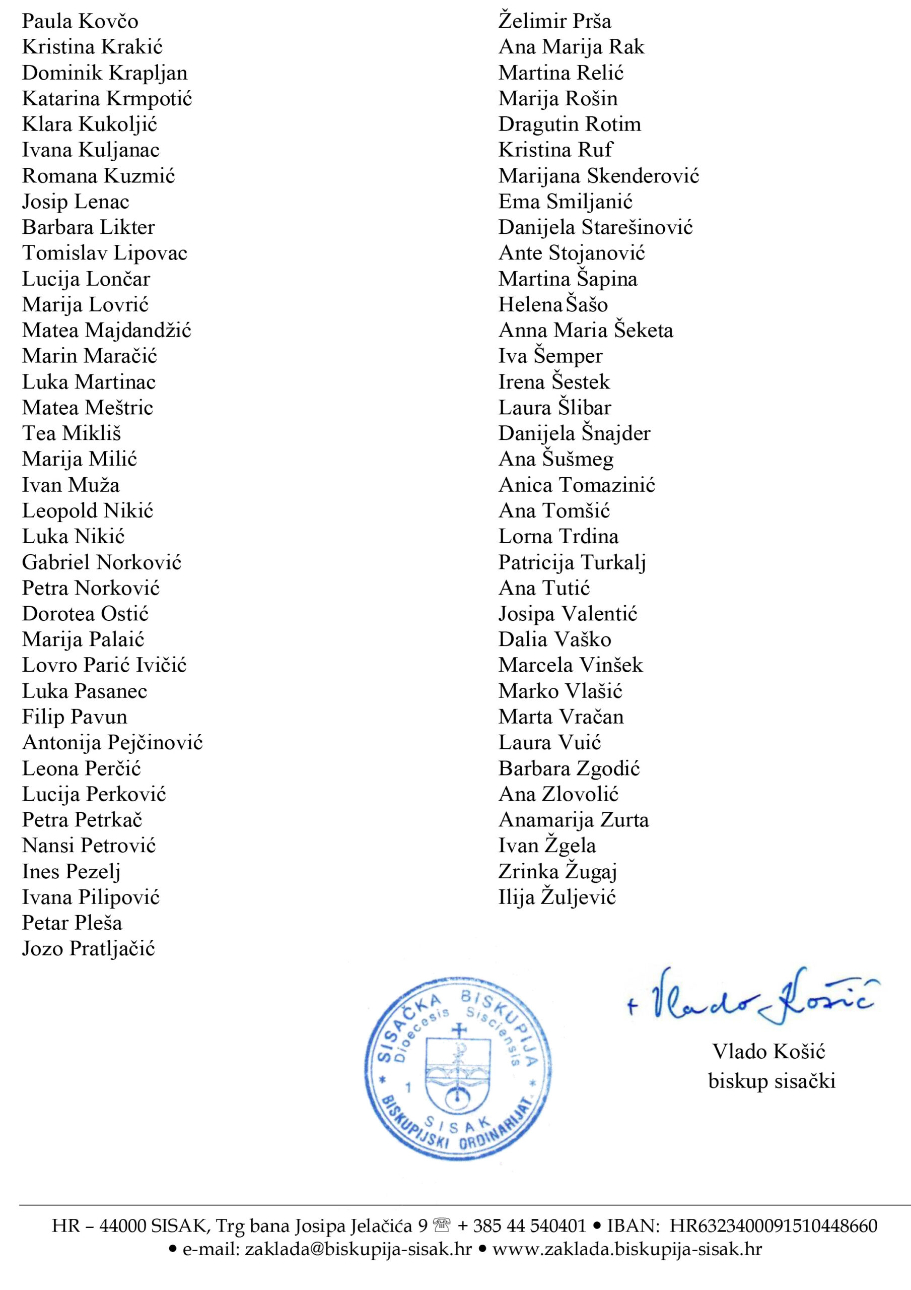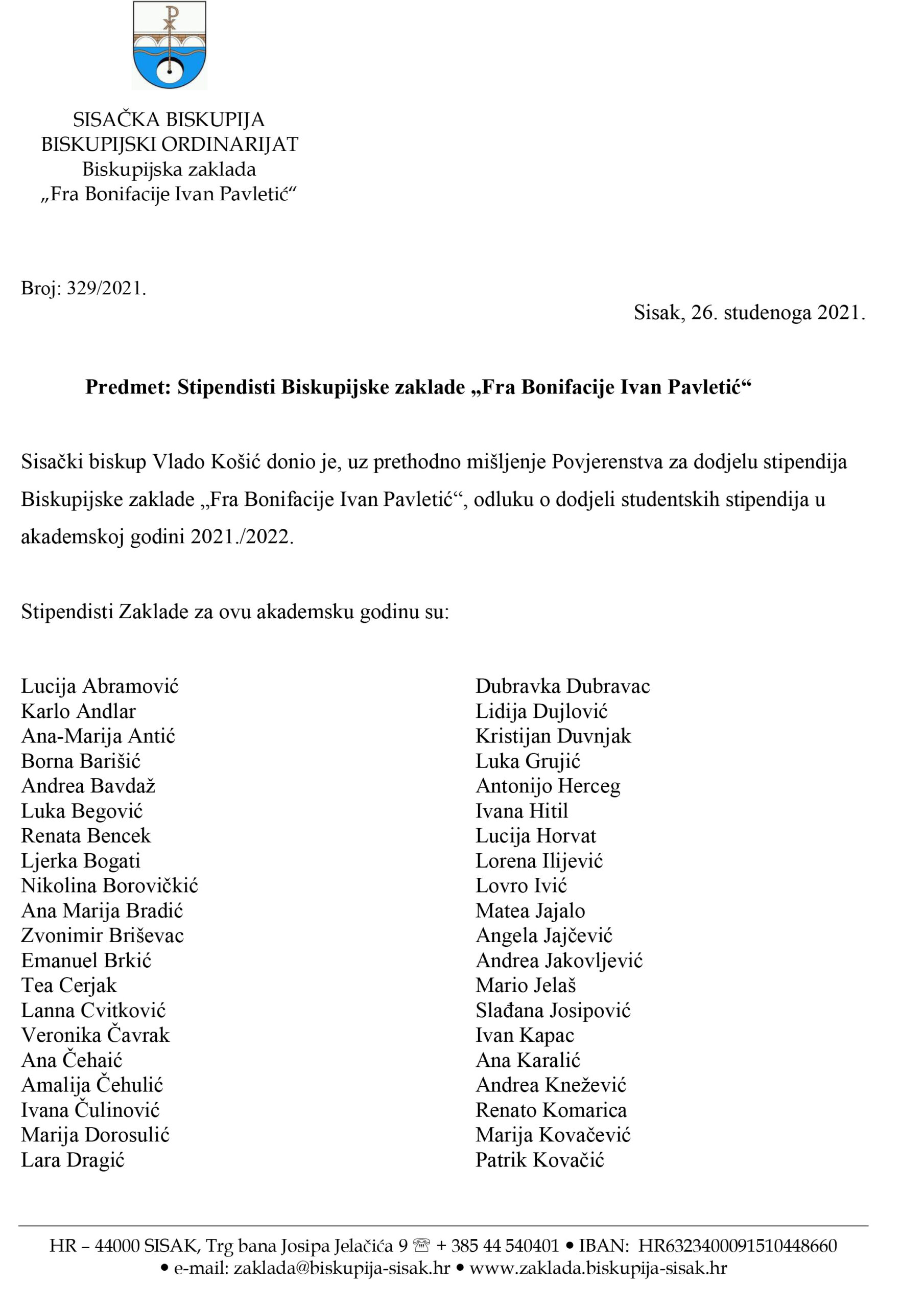 Sisački biskup Vlado Košić donio je, uz prethodno mišljenje Povjerenstva za dodjelu stipendija Biskupijske zaklade „Fra Bonifacije Ivan Pavletić“, odluku o dodjeli studentskih stipendija u akademskoj godini 2021./2022.