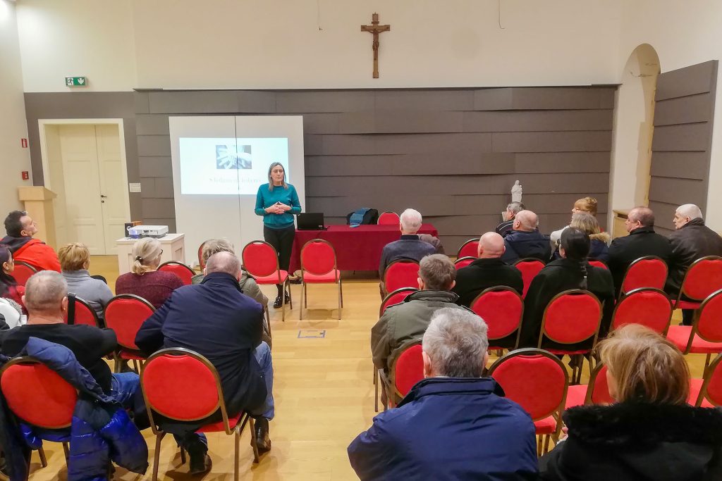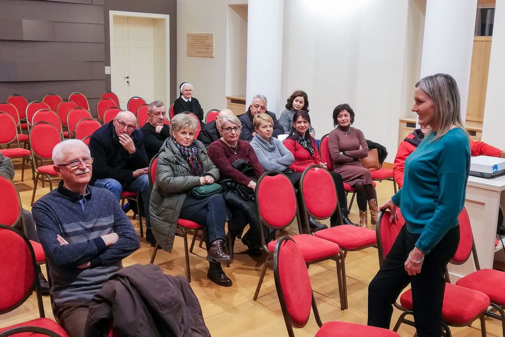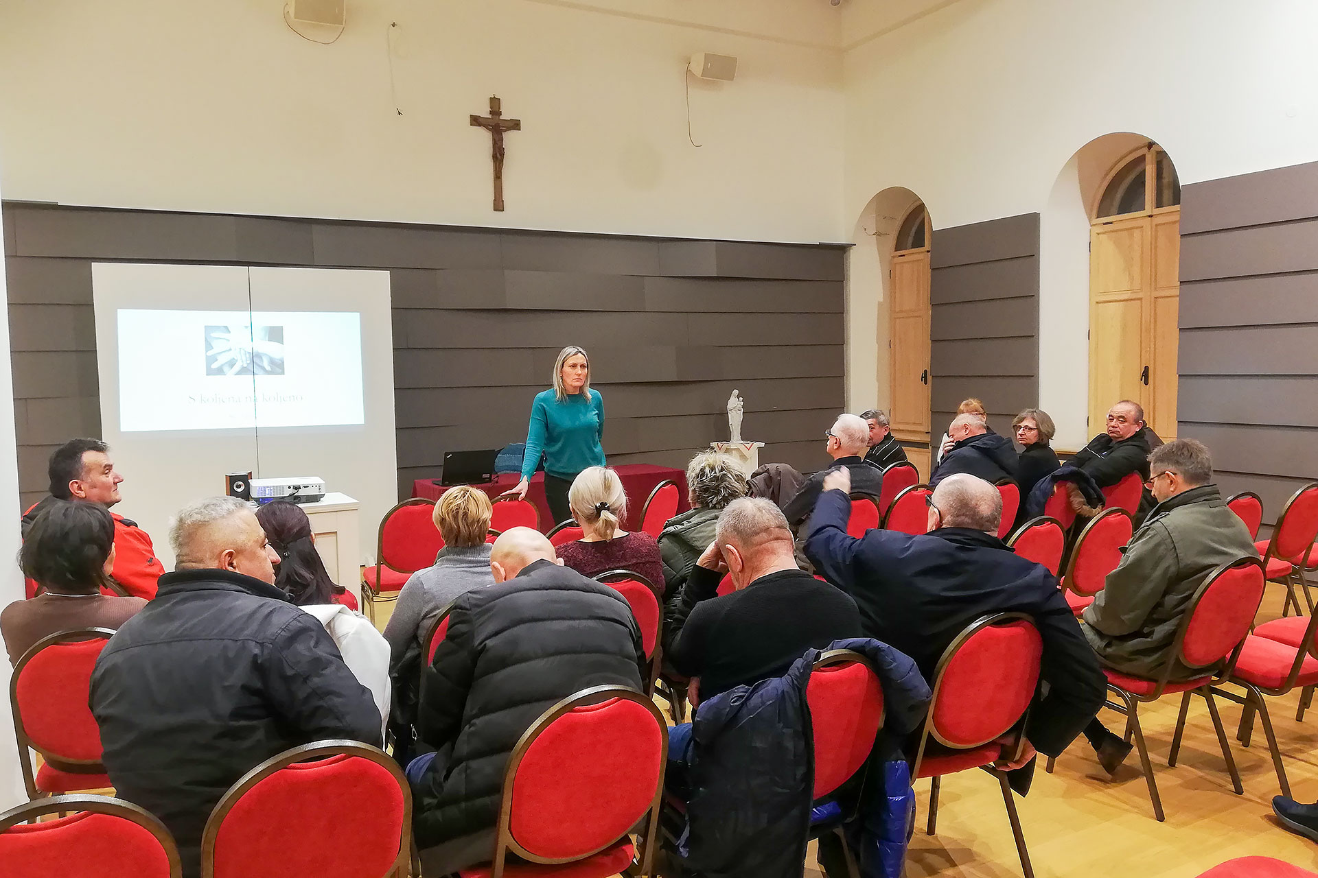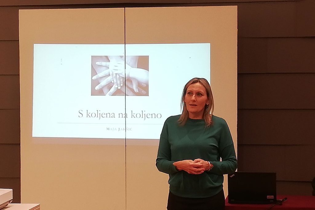 Predavanje na temu “S koljena na koljeno” održala je gđa. Maja Jakšić. Na njen poticaj prisutni su govorili o stvarima koje ih bole, o kojima razmišljaju, koje skrivaju i od sebe samih, ali koje moraju izaći van, jer, prema njenim iskustvima, svaka rana koju nose mora biti zaliječena, a svatko treba pronaći način na koji će to učiniti, pa značilo to i prihvatiti pomoć nekog drugog, jer u drugom slučaju ne može se napredovati niti emocionalno, niti duhovno, niti fizički, zbog čega čovjek ostaje u zatvorenom krugu i ne može ostvariti svoju ulogu stvaratelja.