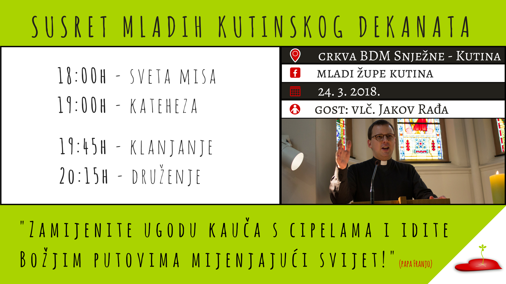 Voditelj susreta, koji je započeo svetom misom, bio je vlč. Jakov Rađa. Nakon svete mise uslijedila je kateheza u kojoj je vlč. Jakov progovorio o smislu i načinu slavljenja Uskrsa, smislu Kristovog križa te smislu osobnih križeva. Tumačeći obrede Vazmenog trodnevlje na mladima aktualan i prihvatljiv način probudio je oduševljenje i želju za nasljedovanjem Isusa Krista. Sluga Božji o. Anto Gabrić to bi izrekao sljedećim riječima: „Treba gorjeti i izgorjeti, zašto bih ja dimio? Gori brate pa izgori“. Za vrijeme euharistijskog klanjanja župnik, vlč. Dragutin Papić i župnik vikar župe Kutinska Slatina, p. Artur Makara bili su na raspolaganju za sakrament svete ispovijedi kojemu su mnogi mladi pristupili.
