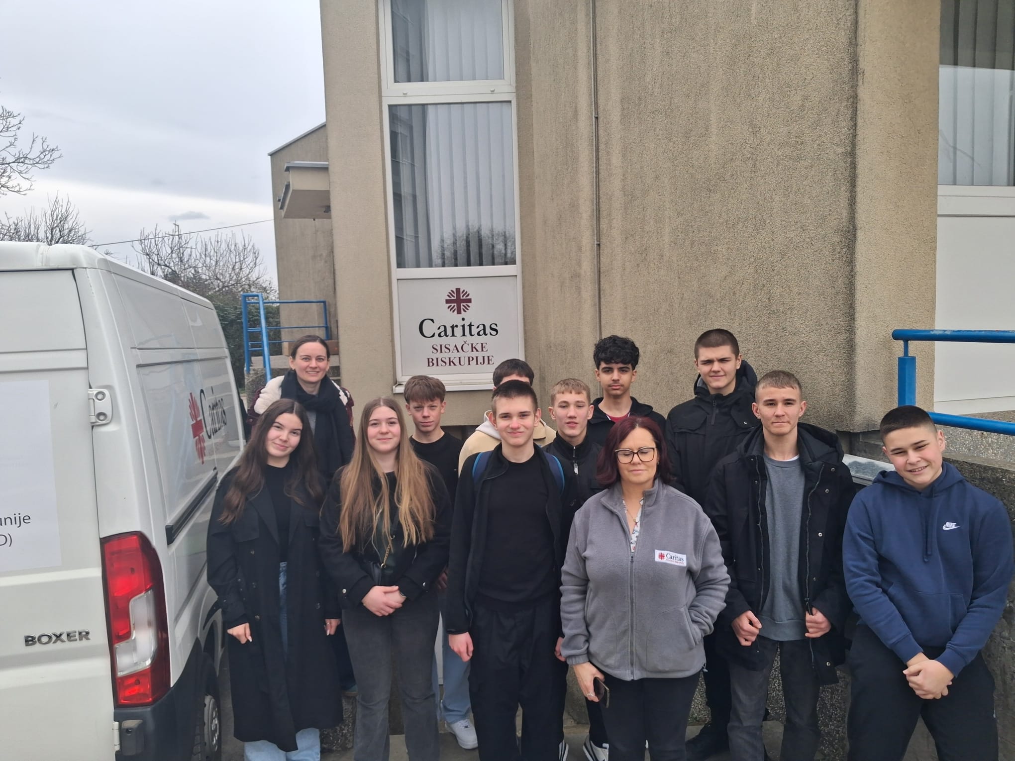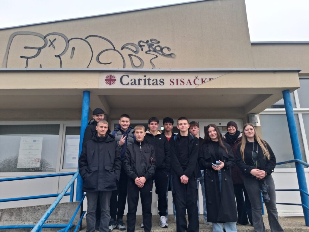 Prva postaja bio je Caritas Sisačke biskupije, gdje su učenici obišli pučku kuhinju, skladište i ured socijalnih radnica. Upoznali su se s konkretnim djelovanjem Caritasa, načinom na koji osobe postaju korisnici pomoći te s predanim radom djelatnika ove ustanove. I sami su sudjelovali u slaganju paketa pomoći za potrebite, osjetivši radost darivanja i služenja. Ondje su se podsjetili na duboko značenje riječi caritas – milosrdna, djelatna ljubav, utemeljena na istini da je Bog ljubav – Deus caritas est. Zajedno s djelatnicima Caritasa učenici su i blagovali, dijeleći ne samo kruh, nego i zajedništvo.