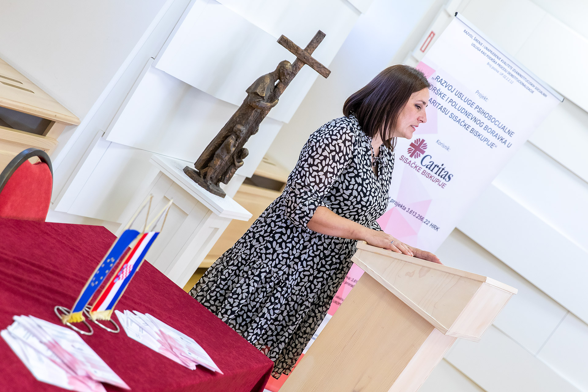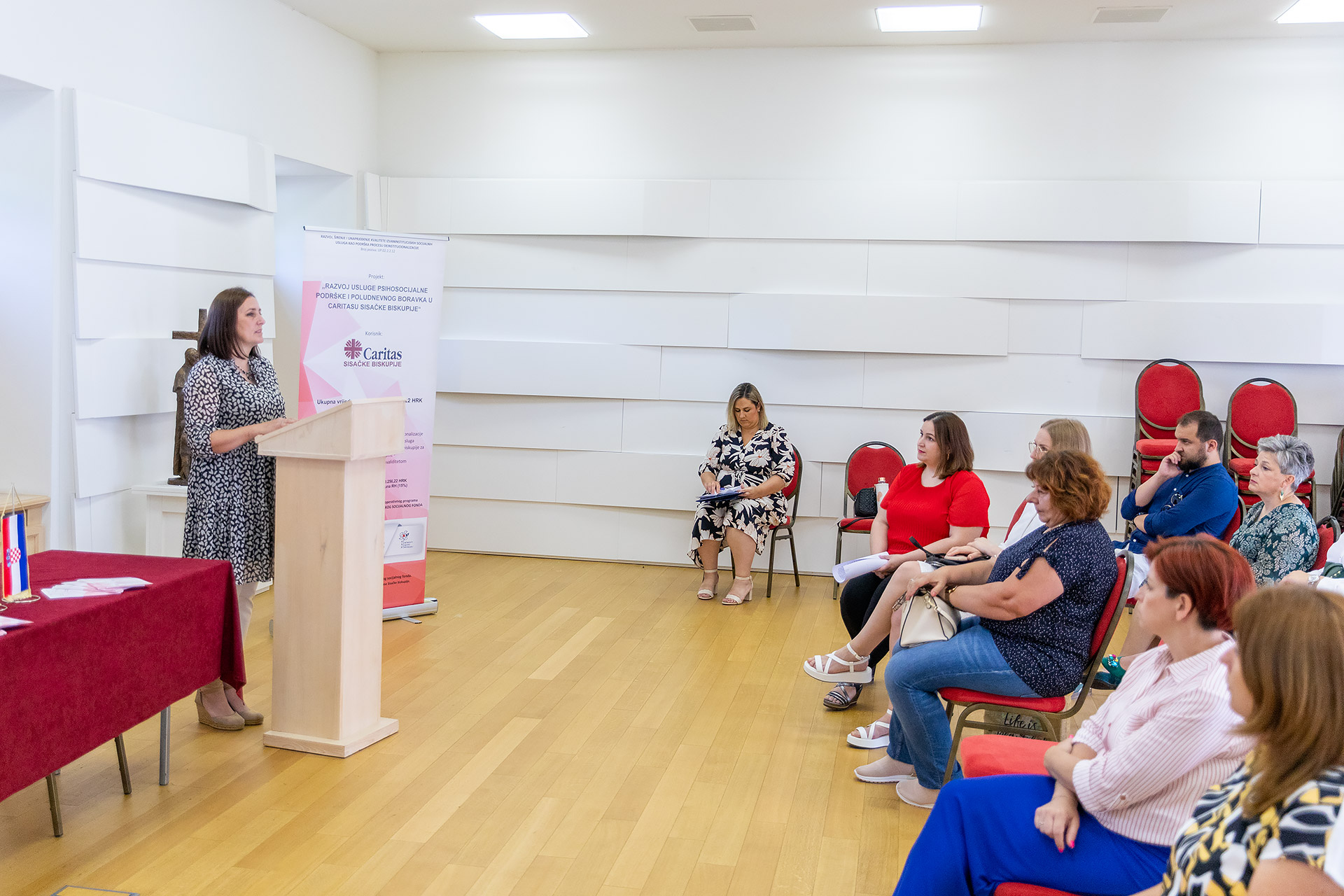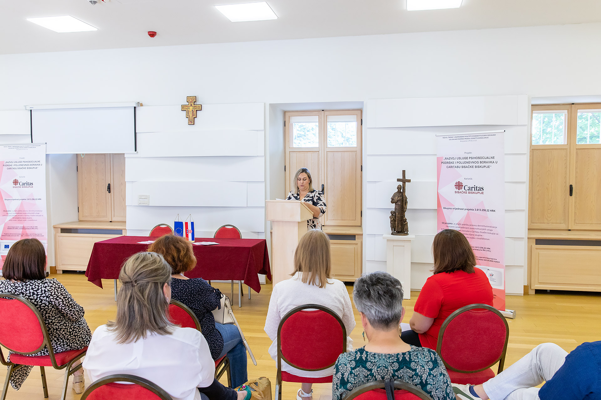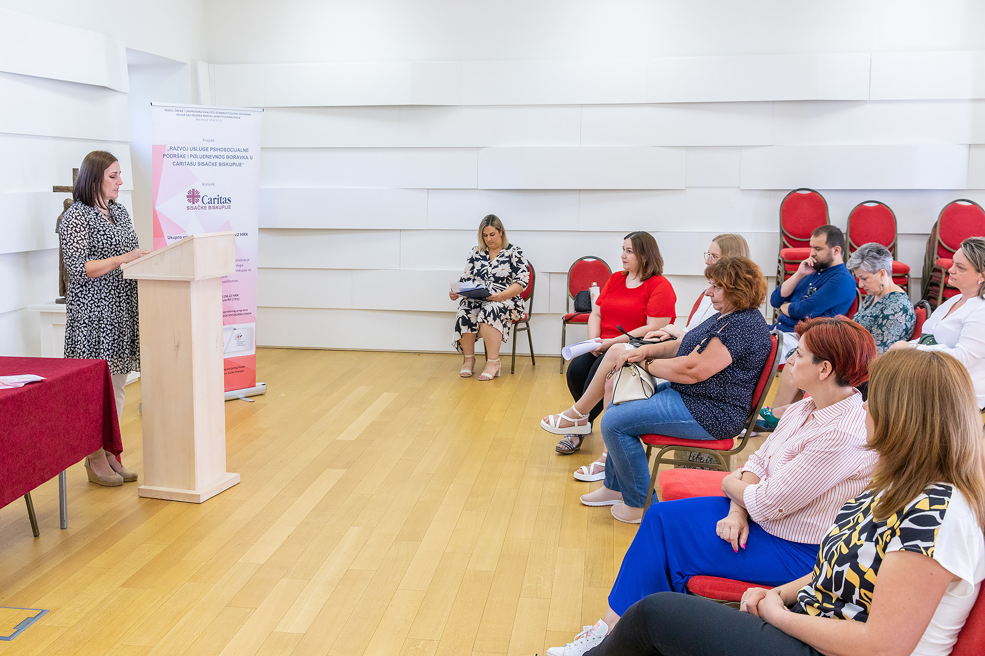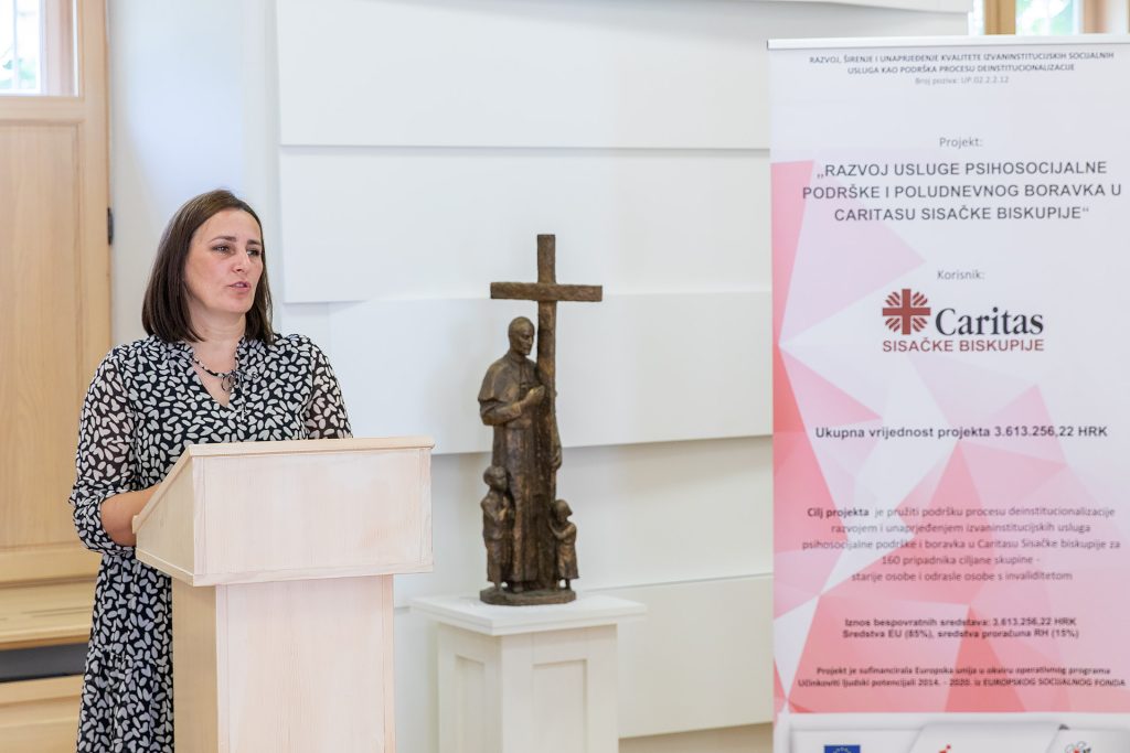 Zahvalivši okupljenima na dolasku kao i svima onima uključenima u provedbu, voditeljica Odjela za projekte sisačkog Caritasa istaknula je kako se ovaj projekt provodio protekle dvije godine, a cilj mu je bio pružiti podršku procesu deinstitucionalizacije razvojem i unapređenjem izvaninstitucijskih usluga psihosocijalne podrške i boravka u Caritasu. Izvaninstitucijske usluge pružile su se za sveukupno 196 osoba, 130 osoba s invaliditetom primalo je uslugu psihosocijalne podrške, a 66 starijih osoba sudjelovalo je u aktivnostima poludnevnog boravka u Caritasu.